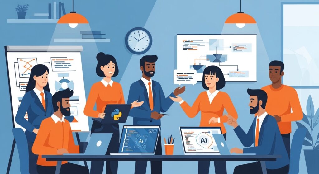 そしてAI開発において、Pythonは事実上の唯一の標準言語です。TensorFlow・PyTorch・scikit-learn・Hugging Face Transformersなど、主要なAIフレームワークのすべてがPythonをファーストクラスでサポートしています。