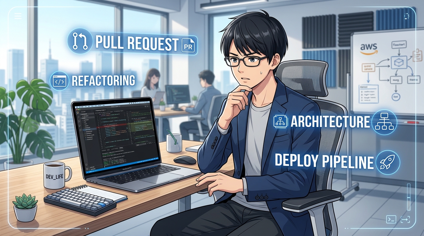 さらに、アーキテクチャやデプロイパイプラインなどは複数領域の知識が絡むため、初心者ほど理解しづらいです。これが「現場についていけない」という不安につながります。