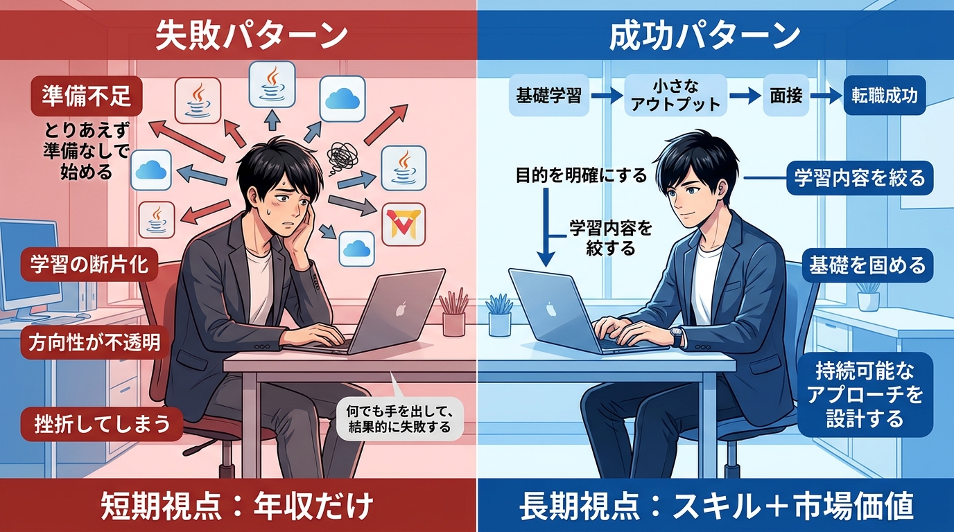 よくある失敗は、学習範囲を広げすぎることです。Javaもクラウドもデザインも気になって手を出すと、どれも浅く終わります。未経験からの転職では、まず一つの土台を作ることが優先です。基礎を固めずに応募を急ぐと、面接でも自信を持って話せません。