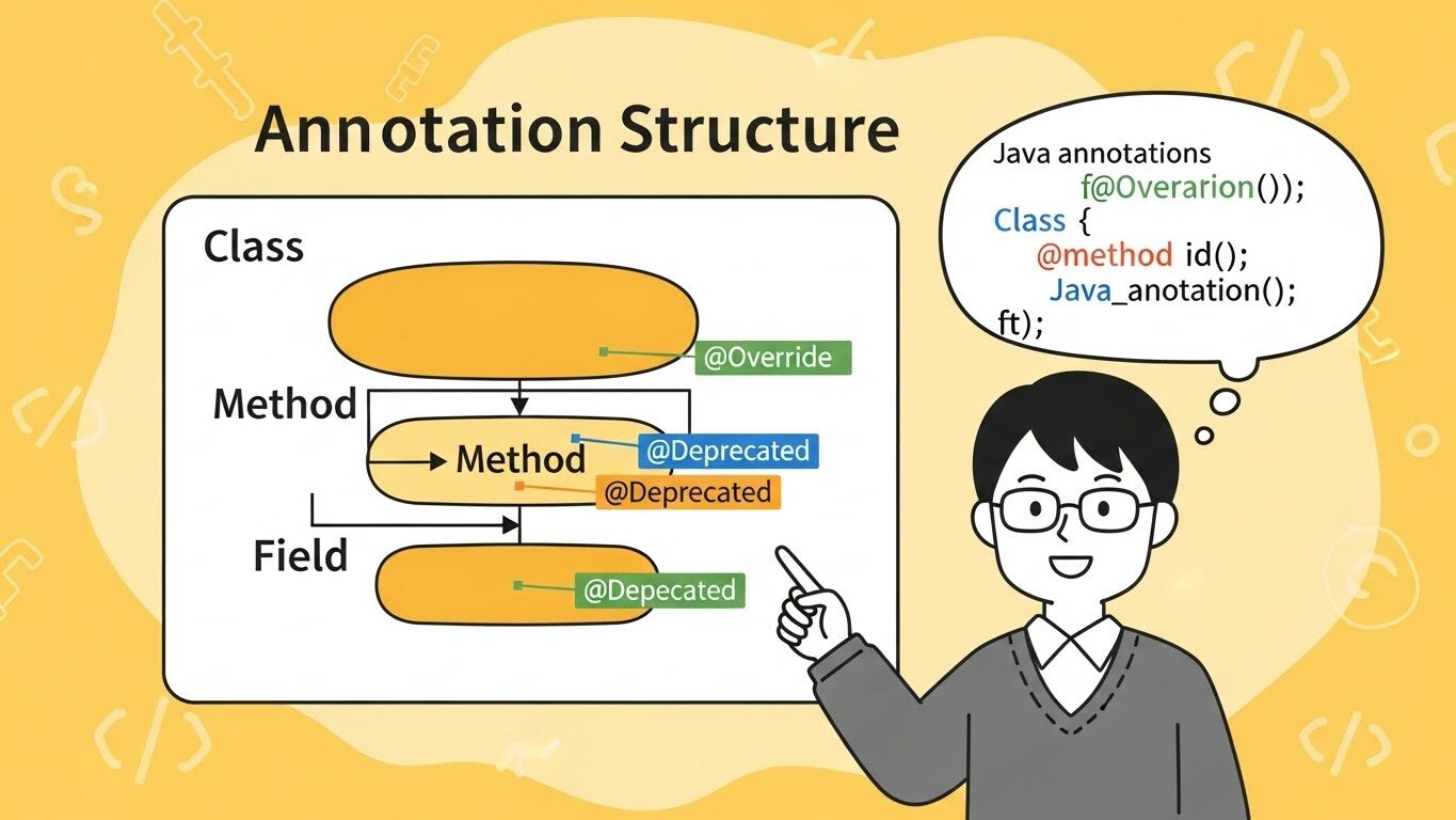 Javaアノテーションの基本構造を理解することは、エンジニアとして実務に適応するための第一歩です。アノテーションはクラス、メソッド、フィールドなどに付与でき、それぞれ異なる意味を持ちます。どこに付与されているかを見るだけでも、その対象がどのような役割を担っているかを推測できます。