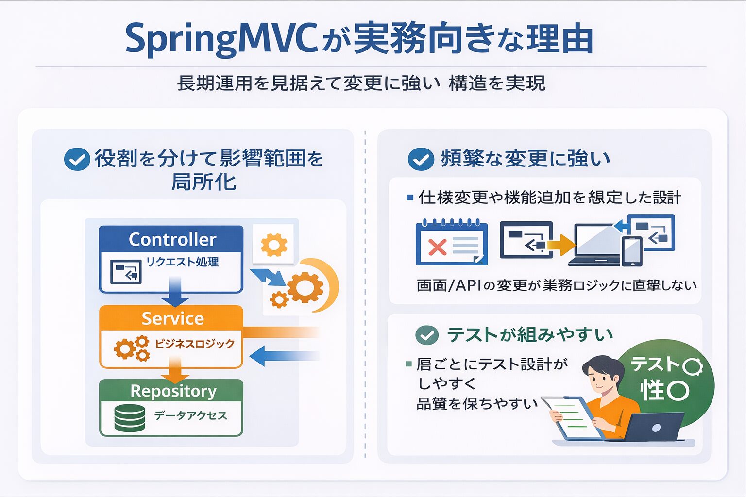 Spring FrameworkのMVC構成が多くの現場で採用されている理由は、短期的な開発効率だけでなく、長期運用を見据えた設計にあります。実務で直面するのは、新規開発よりも仕様変更や機能追加です。