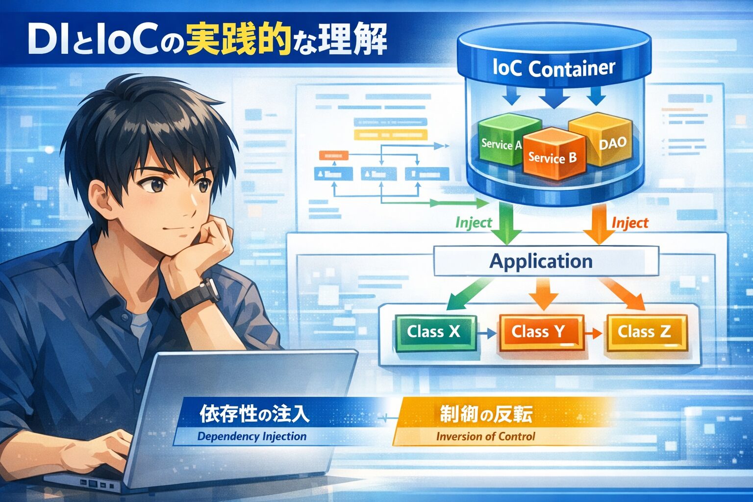 Springの根幹にあるのがIoCコンテナです。従来はクラス内部でnewしていたインスタンス生成をコンテナが管理することで、依存関係の注入が可能になります。