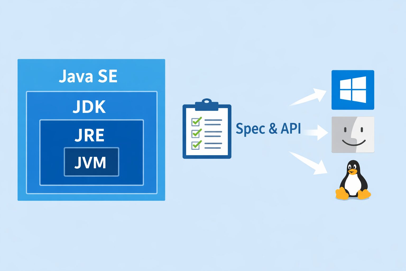 そのため本記事では、まずJava SE=仕様と標準APIの範囲という位置づけから整理し、次にJDK/JRE/JVM=実際に動かすための配布物として役割分担をつなげます。