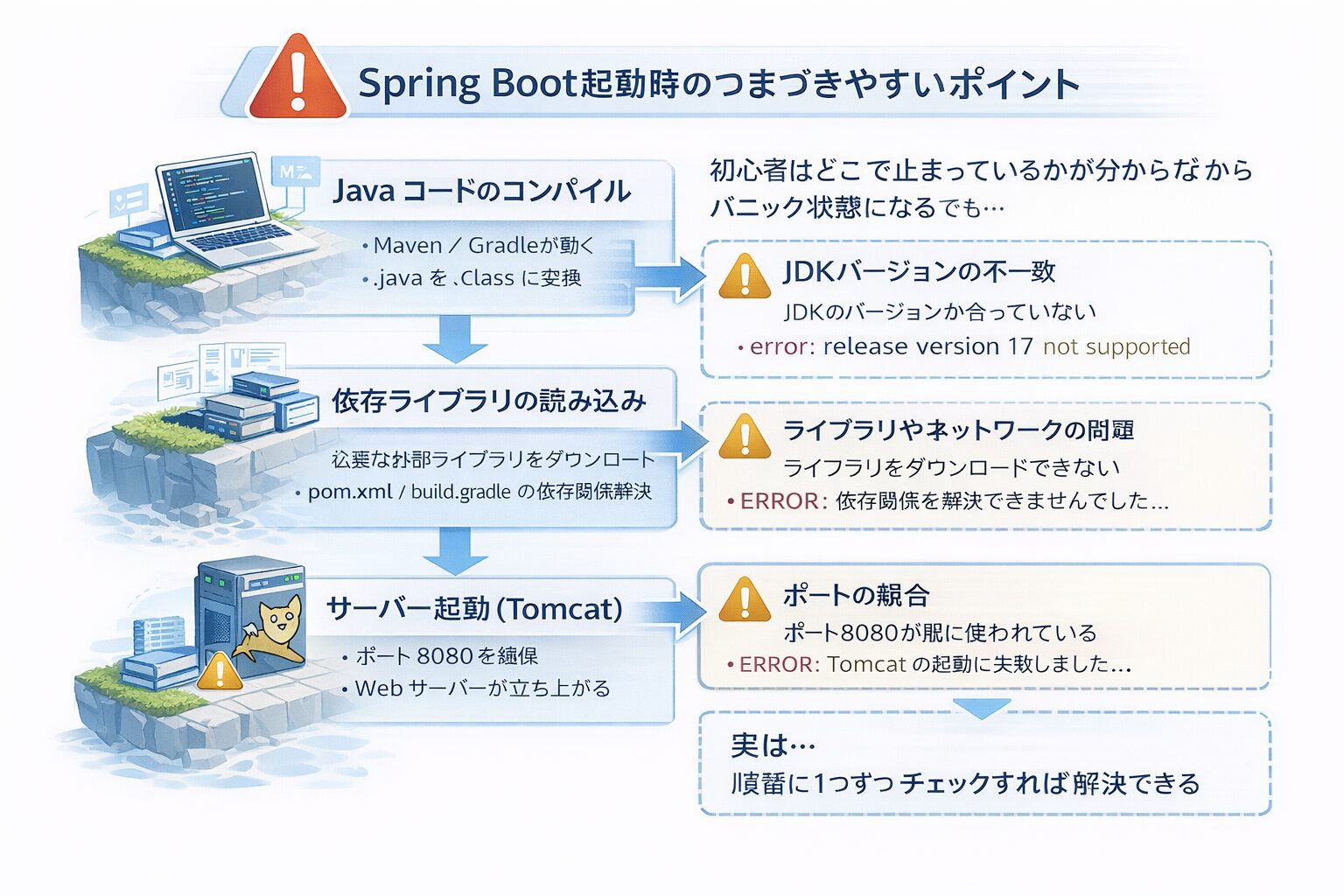 Spring Bootの起動は、いわば「総力戦」です。依存関係の解決、ソースコードのビルド、サーバーのポート確保など、多くの工程がすべて成功して初めてアプリは動き出します。