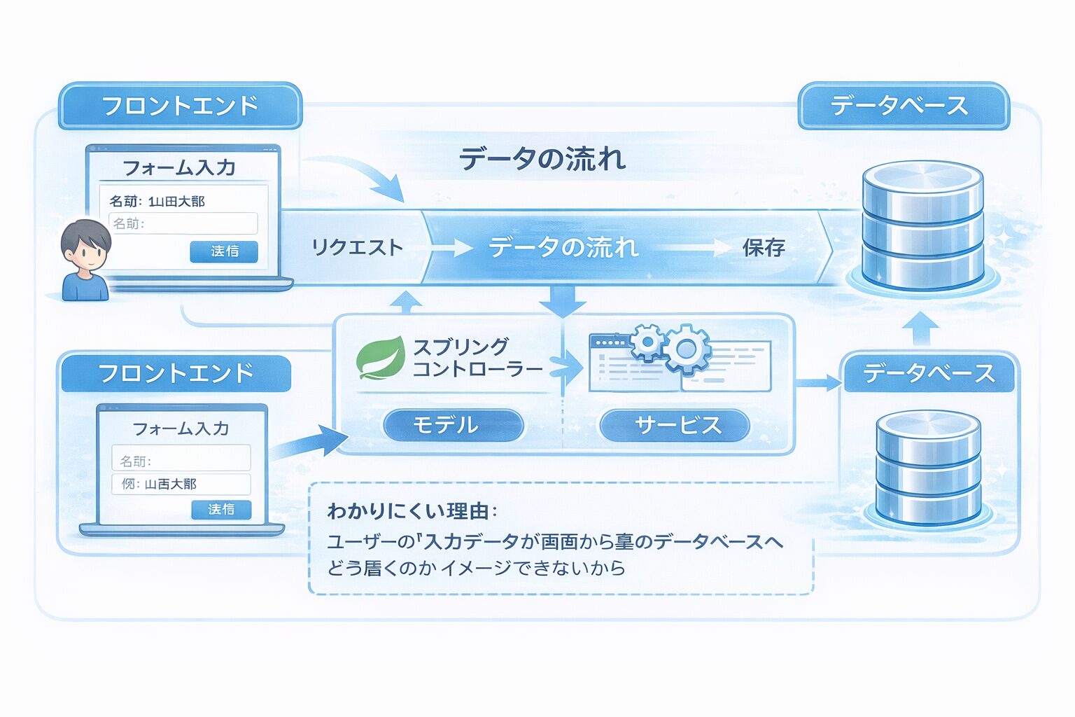 混乱の本質は、「フロントエンド(画面)」と「バックエンド(裏側)」の連携がイメージできていないことにあります。JavaのWeb開発では、画面から送られたデータがどう処理され、データベースにどう届くのかという「データの旅」を理解する必要があります。